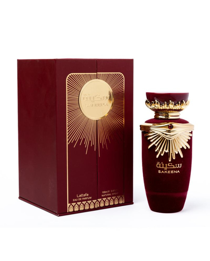 O Lattafa Sakeena Eau de Parfum é uma fragrância única de notas florais e orientais. É um perfume de luxo, elegância e requinte. As notas de base é de baunilha, almíscar e tofee, com as notas de topo são de maracujá e tangerina que dá uma frescura é também composto com aromas de rosa, flor de laranjeira, framboesa e sale du marin. É uma fragrância ideal para as mulheres que querem se sentir com um cheiro único.